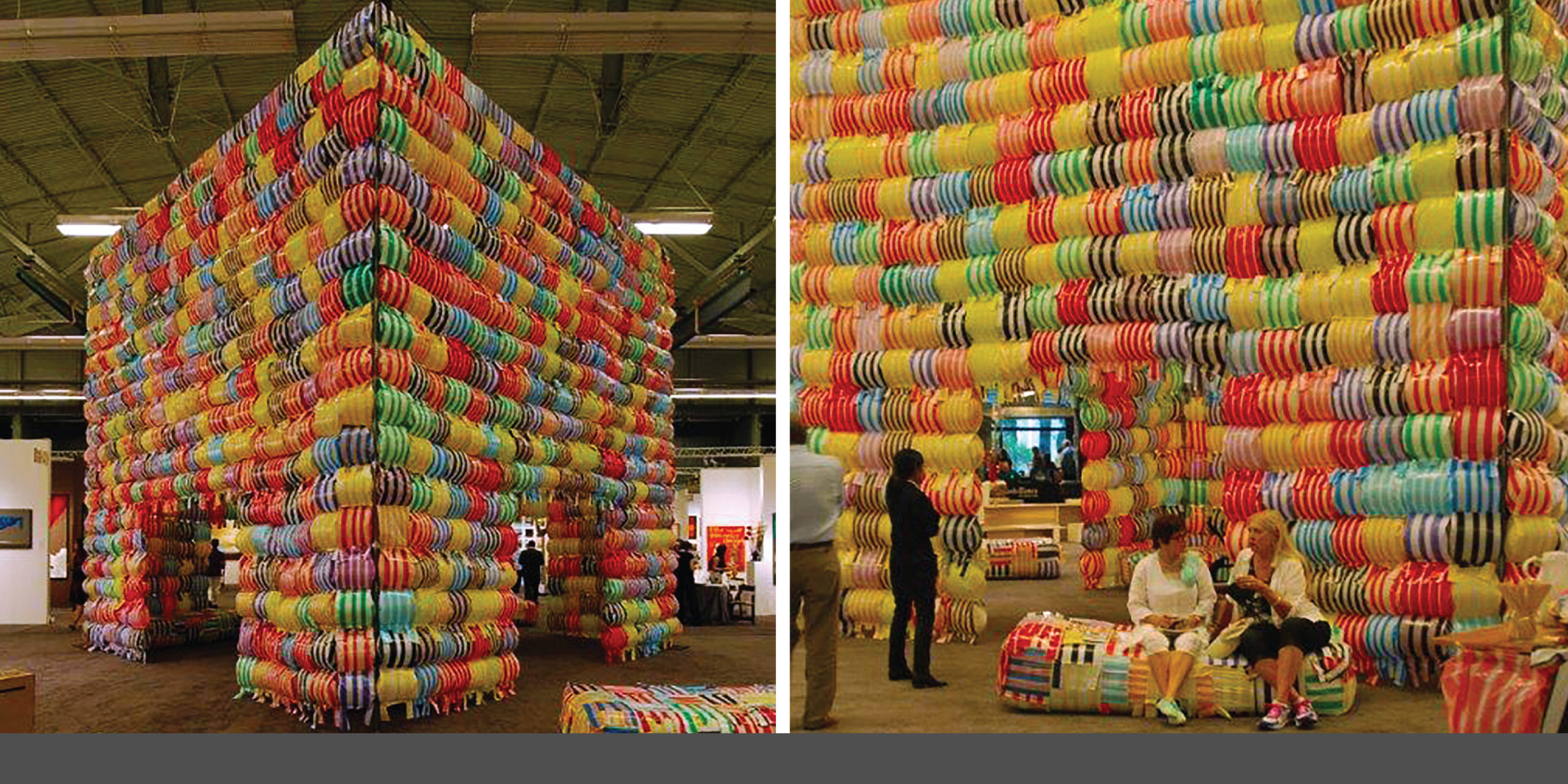 Striped plastic bags, steel, grommets, zip ties. 20.0 ft – H, 20.0 ft – L, 20.0 ft – W.